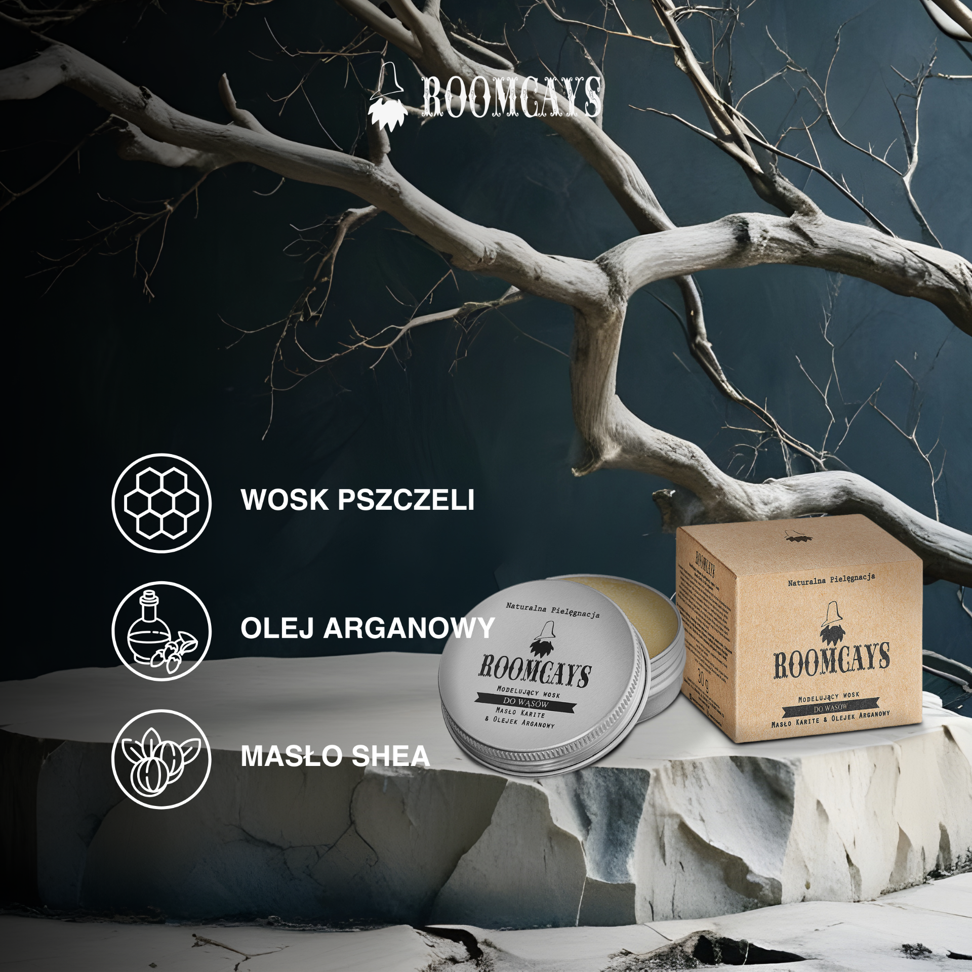 Roomcays Bıyık Şekillendirme Mumu, bıyığa kolayca şekil vermeye ve gün boyu formunu korumaya yardımcı olur.